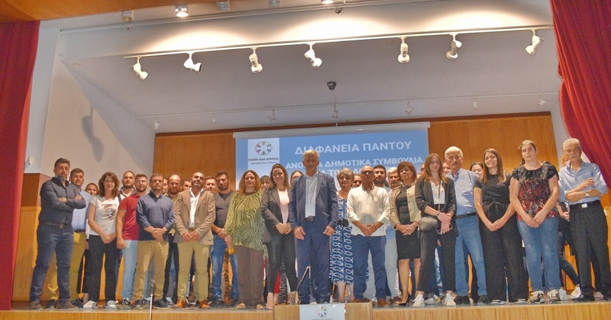 Στην αίθουσα του Δήμου η εκδήλωση, που δεν είχε σε τίποτα να ζηλέψει από προεκλογικές συγκεντρώσεις σε μεγάλα αστικά κέντρα, ξεκίνησε με παρουσίαση των 71 υποψηφίων που απαρτίζουν το ψηφοδέλτιο νίκης του Συνδυασμού.