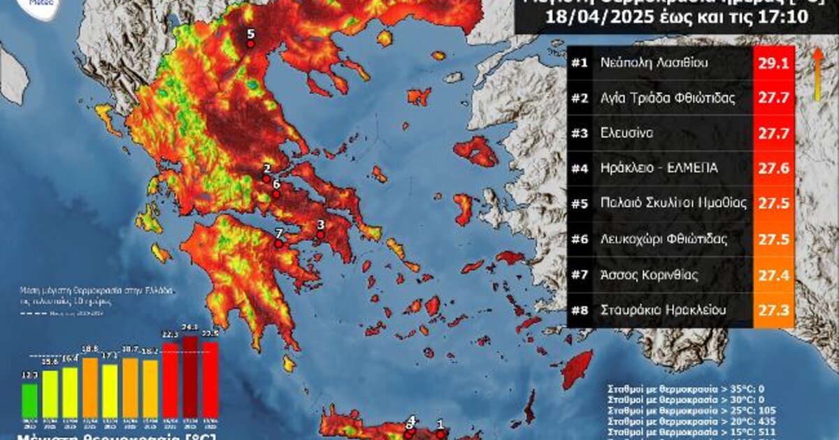 Στον παρακάτω χάρτη αποτυπώνονται οι μέγιστες θερμοκρασίες έως τις 17:10 της Μεγάλης Παρασκευής 18/04, ενώ στον πίνακα παρουσιάζονται οι 8 υψηλότερες μέγιστες τιμές από 524 μετεωρολογικούς σταθμούς του δικτύου αυτόματων μετεωρολογικών σταθμών του Εθνικού Αστεροσκοπείου Αθηνών / meteo.gr.