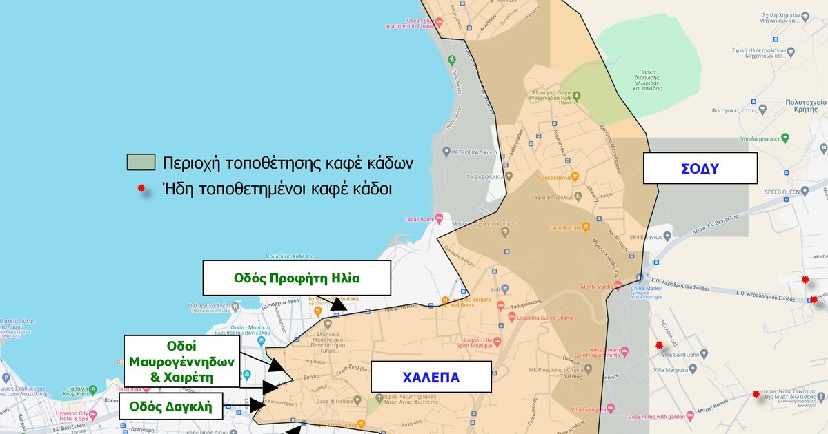 - Χαλέπα [MONO στην περιοχή που περικλείεται μεταξύ των οδών: Προφήτη Ηλία, Χαλέπας, Μαυρογένηδων, Χαιρέτη, Δαγκλή, Κ. Μητσοτάκη (πρώην Ακρωτηρίου) έως τον κόμβο του Πολυκλαδικού]