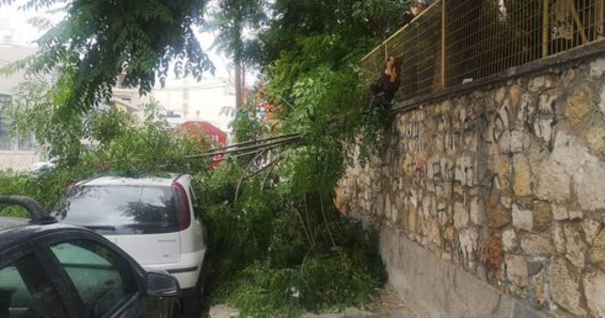 Ένα δέντρο που προφανώς δεν άντεξε και από τους ισχυρούς ανέμους έπεσε στην οδό Γερωνυμάκη, στο κέντρο του Ηρακλείου, πάνω σε σταθμευμένα αυτοκίνητα.