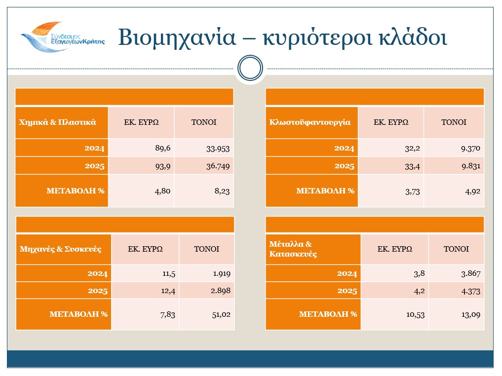 «Ιδιαίτερα ενθαρρυντικό είναι το γεγονός ότι κατά το α’ 6μηνο του 2025 καταγράφηκε αύξηση στους περισσότερους από τους βασικούς εξαγώγιμους κλάδους, όπως στα Τρόφιμα & Ποτά, τα Χημικά & Πλαστικά, την Κλωστοϋφαντουργία κ.α. Αυτή η θετική εξέλιξη δεν περιορίζεται μόνο σε αριθμητικό επίπεδο, αλλά αποτυπώνει και την αυξανόμενη αναγνώριση της ποιότητας, της αυθεντικότητας και της ανταγωνιστικότητας των κρητικών προϊόντων στις διεθνείς αγορές».