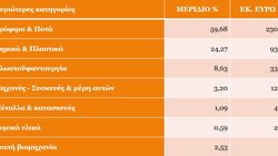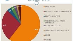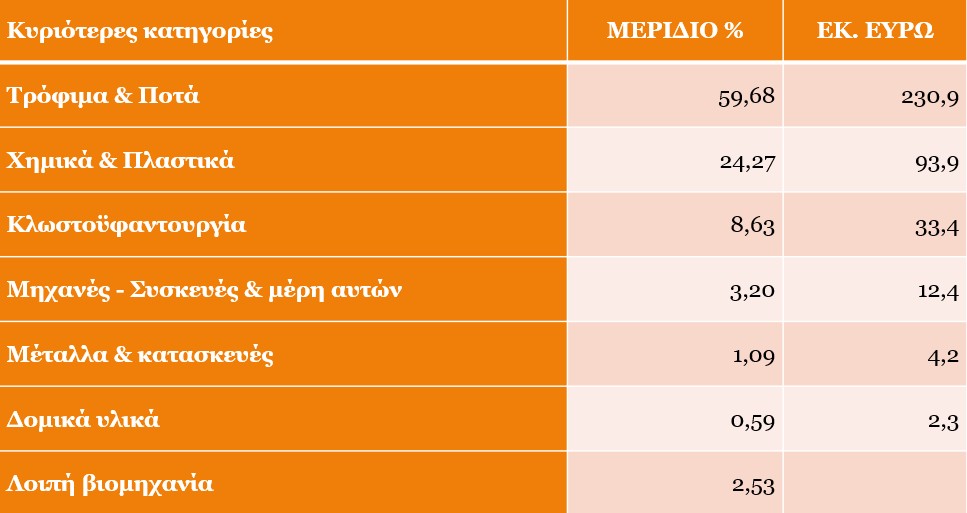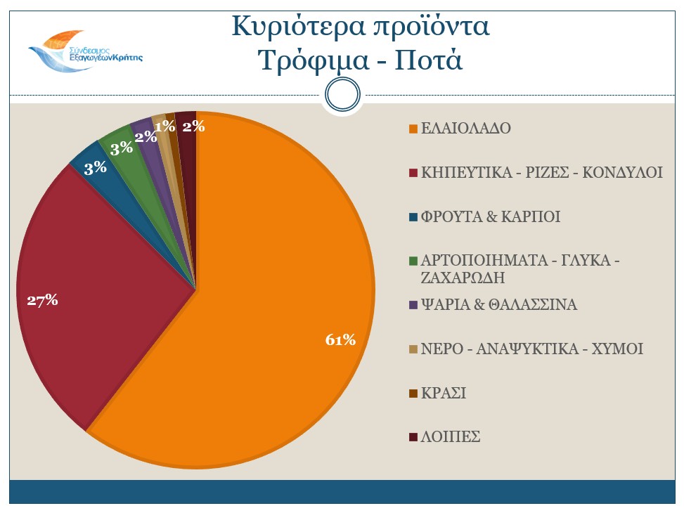 Στον αγροδιατροφικό τομέα, το Ελαιόλαδο έφτασε τα 139.8 εκ. ευρώ, παρουσιάζοντας μικρή αύξηση 0,6% σε αξία αλλά 55,7% σε ποσότητα, τα Κηπευτικά τα 62,3 εκ. ευρώ με αύξηση 10,5% σε αξία και 2,4% σε ποσότητα, η κατηγορία των Φρούτων & Καρπών τα 7,5 εκ. ευρώ και εντυπωσιακή αύξηση 63% και ακολουθούν οι κατηγορίες των Αρτοποιημάτων – Γλυκών - Ζαχαρωδών (αύξηση 10,5%), των Ψαριών & θαλασσινών (μείωση 31,9%) και των νερών – Αναψυκτικών – Χυμών (αύξηση 20%).