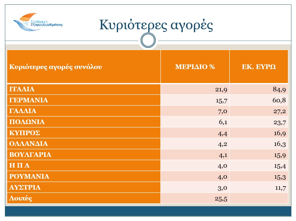 Σχετικά με τις αγορές, οι κυριότεροι αγοραστές των Κρητικών προϊόντων είναι η Ιταλία με τις εξαγωγές κατά το διάστημα Ιανουαρίου – Ιουνίου 2025 να φτάνουν τα 84,9 εκ. ευρώ, η Γερμανία με 60,8 εκ. ευρώ, η Γαλλία με 27,2 εκ. ευρώ, η Πολωνία με 23,7 εκ. ευρώ και η Κύπρος με 16,9 εκ. ευρώ. Τη δεκάδα των κυριότερων αγοραστών κλείνουν η Ολλανδία, η Βουλγαρία, οι Η.Π.Α., η Ρουμανία και η Αυστρία.