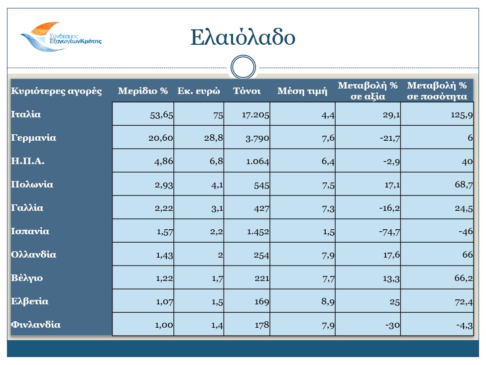 Για το κυριότερο εξαγώγιμο προϊόν της Κρήτης, το ελαιόλαδο, τους κυριότερους αγοραστές αποτελούν διαχρονικά η Ιταλία, η Γερμανία, οι Η.Π.Α., η Πολωνία και η Γαλλία.