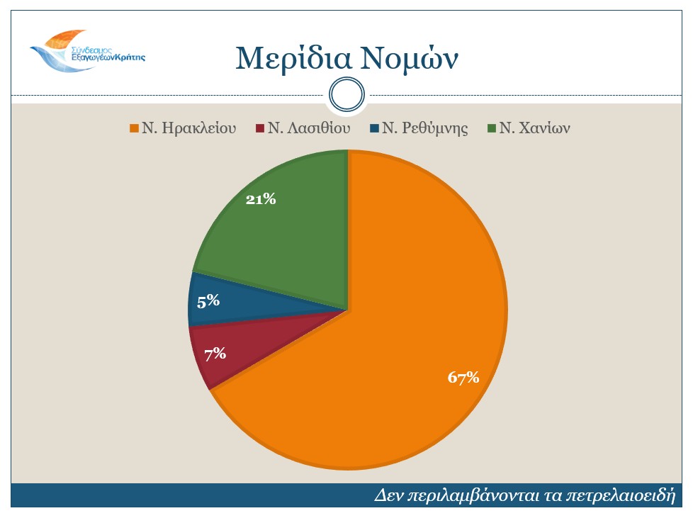 Αναφορικά με τους Νομούς της Κρήτης, εκτός από το Νομό Χανίων, ο οποίος παρουσίασε μείωση ίση με 16,9%, οι υπόλοιποι εμφάνισαν αύξηση και συγκεκριμένα ο Νομός Ηρακλείου 8,4%, ο Νομός Λασιθίου 38% και ο Νομός Ρεθύμνης 23,7% (σε αξία).