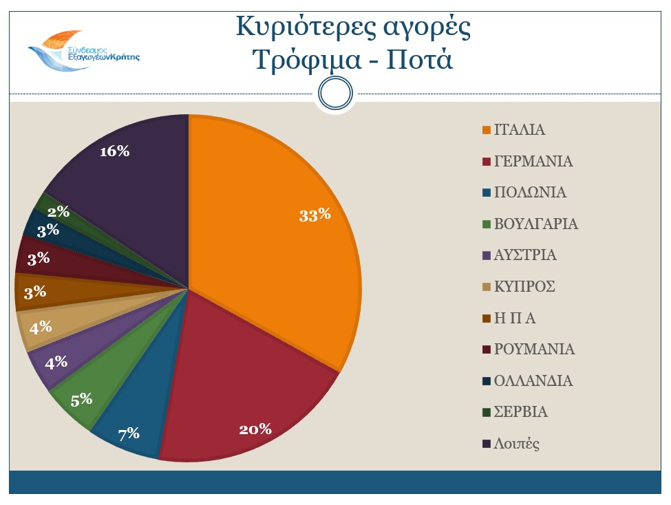 Για τον κλάδο των Τροφίμων & Ποτών, τους κυριότερους αγοραστές αποτελούν η Ιταλία, με τις εξαγωγές να φτάνουν τα 76,3 εκ. ευρώ και μερίδιο 33%, η Γερμανία με 45,5 εκ. ευρώ και μερίδιο 19,7%, η Πολωνία με 15,8 εκ. ευρώ και μερίδιο 6,8%, η Βουλγαρία με 12,2 εκ. ευρώ και μερίδιο 5,3% και η Αυστρία με 9,5 εκ. ευρώ και μερίδιο 4,1%. Ακολουθούν η Κύπρος, οι Η.Π.Α., η Ρουμανία, η Ολλανδία και η Σερβία.