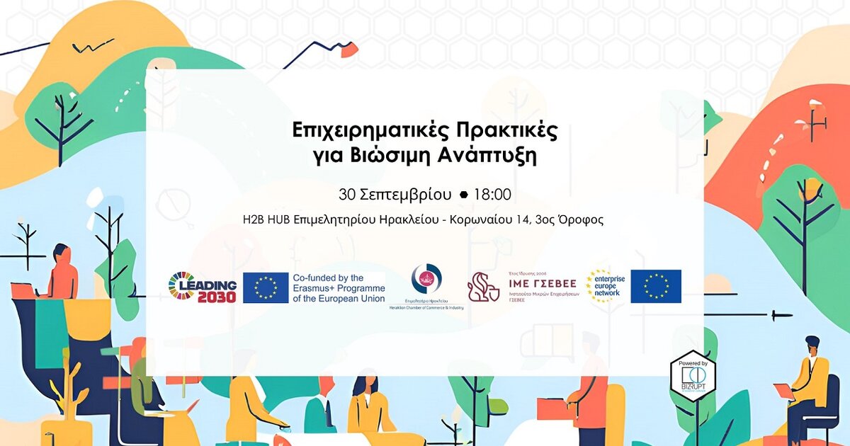 Το Επιμελητήριο Ηρακλείου - μέλος του Δικτύου Enterprise Europe Network – σε συνεργασία με το ΙΜΕ ΓΣΕΕΒΕ διοργανώνουν ενημερωτική εκδήλωση με θέμα «Επιχειρηματικές Πρακτικές για Βιώσιμη Ανάπτυξη» στο πλαίσιο υλοποίησης του προγράμματος “Leading 2030” Erasmus+.