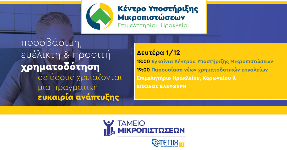 Το Κέντρο Υποστήριξης Μικροπιστώσεων, μία από τις σημαντικότερες νέες υπηρεσίες του Επιμελητηρίου Ηρακλείου προς τα μέλη του, έχει στόχο να καλύψει το κενό χρηματοδότησης για μικρές και πολύ μικρές επιχειρήσεις που δεν πληρούν τραπεζικά κριτήρια, καθώς και να παρέχει ολοκληρωμένη υποστήριξη για τα μικροδάνεια έως 25.000 ευρώ που διαχειρίζεται η Ελληνική Αναπτυξιακή Τράπεζα (HDB).