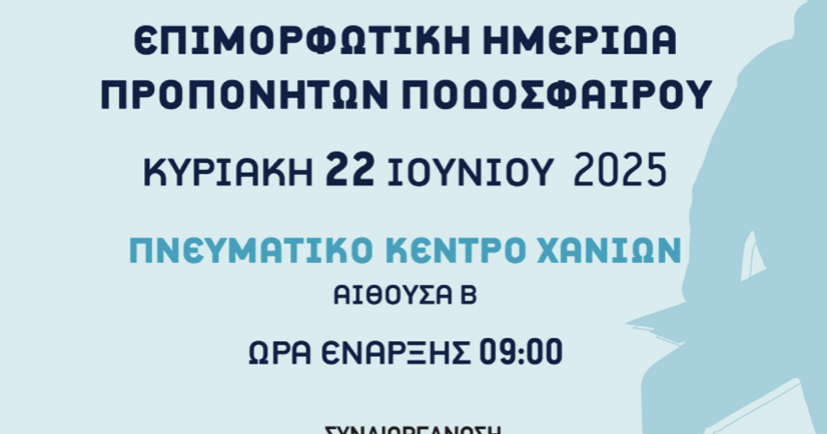 Ο Σύνδεσμος Προπονητών Ποδοσφαίρου Νομού Χανίων, σε συνδιοργάνωση με την Περιφέρεια Κρήτης – Περιφερειακή Ενότητα Χανίων, διοργανώνει Επιμορφωτική Ημερίδα Προπονητών Ποδοσφαίρου, την Κυριακή 22 Ιουνίου 2025, στις 9.00 π.μ., στο 2ο όροφο του Πνευματικού Κέντρου Χανίων.