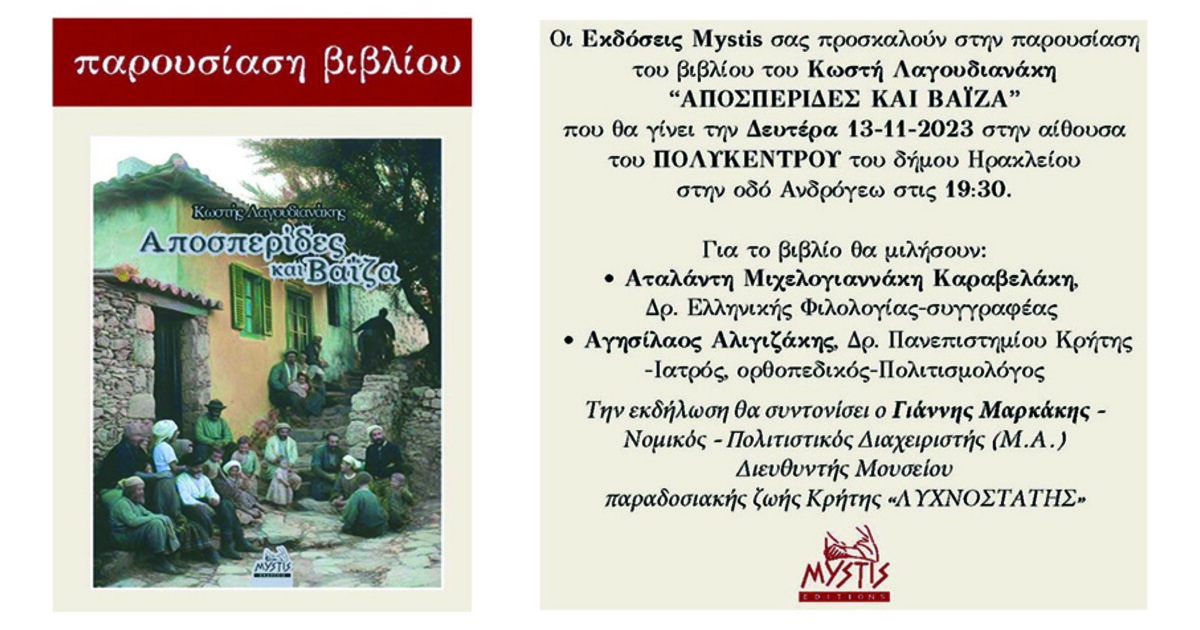 Οι Εκδόσεις Mystis διοργανώνουν την παρουσίαση του βιβλίου του Κωστή Λαγουδιανάκη με τίτλο “ΑΠΟΣΠΕΡΙΔΕΣ ΚΑΙ ΒΑΪΖΑ”.