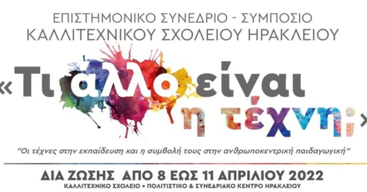Η Περιφέρεια Κρήτης, η Περιφερειακή Διεύθυνση Εκπαίδευσης Κρήτης, το Καλλιτεχνικό Σχολείο Ηρακλείου και ο «Σύλλογος Φίλων Καλλιτεχνικού Σχολείου Ηρακλείου» συνδιοργανώνουν με τον Δήμο Χερσονήσου και τη στήριξη της πολυμετοχικής Δημοτικής Α.Ε Πολιτισμού Τουρισμού Ανάπτυξης Ηρακλείου (ΔΕΠΑΝΑΛ), Επιστημονικό Συνέδριο – Συμπόσιο με θέμα: «Τι άλλο είναι η τέχνη; Οι τέχνες στην εκπαίδευση και η συμβολή τους στην ανθρωποκεντρική παιδαγωγική» με την αιγίδα του Τμήματος Θεατρικών Σπουδών, Πανεπιστημίου Πατρών.