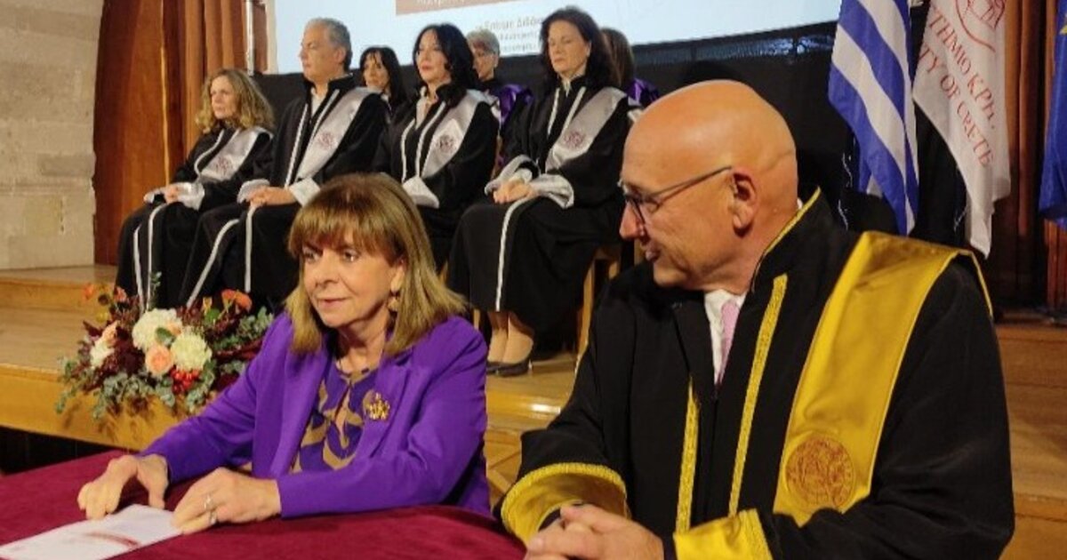 Με ομόφωνη απόφαση της συνέλευσης του τμήματος Φιλοσοφίας της Φιλοσοφικής Σχολής του Πανεπιστημίου Κρήτης, αναγορεύθηκε Επίτιμη Διδάκτωρ η ΠτΔ Κατερίνα Σακελλαροπούλου, απόψε, κατά τη διάρκεια τελετής στο Ωδείο της Παλιάς Πόλης του Ρεθύμνου.