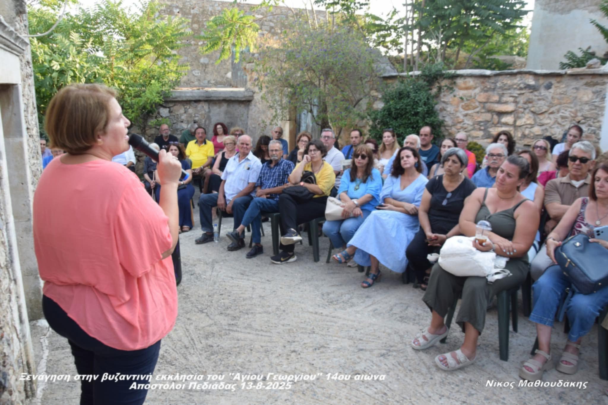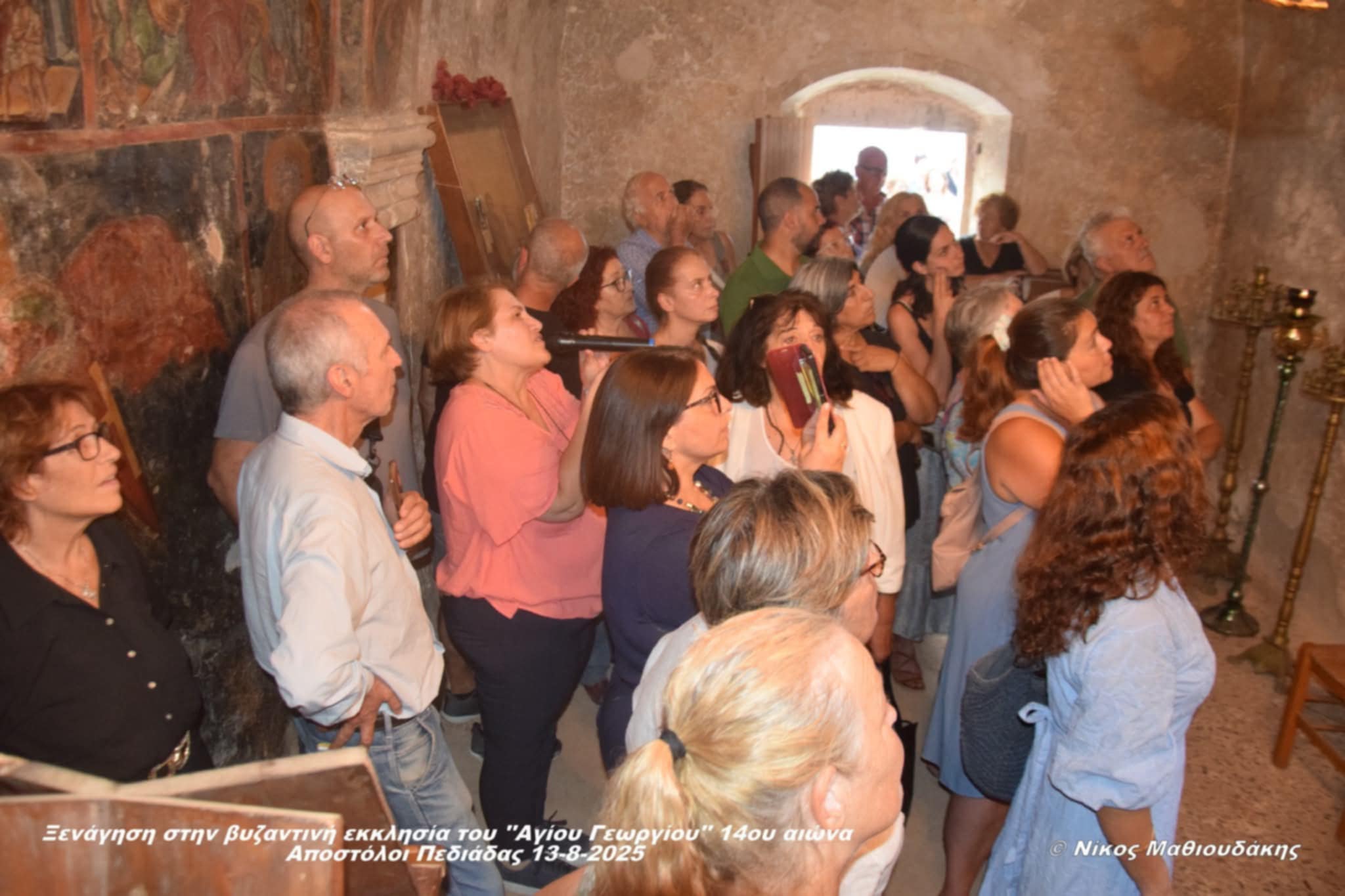 Αρχικά, πραγματοποιήθηκε ξενάγηση στη Βυζαντινή εκκλησία του Αγίου Γεωργίου, την οποία παρουσίασε η Αρχαιολόγος και Προϊσταμένη του Τμήματος Βυζαντινών & Μεταβυζαντινών Αρχαιοτήτων & Μουσείων της Εφορείας Αρχαιοτήτων Ηρακλείου Ελένη Κανάκη ενώ οι παρευρισκόμενοι είχαν την ευκαιρία να απολαύσουν ένα νόστιμο κέρασμα από τον Πολιτιστικό Σύλλογο Αποστόλων.