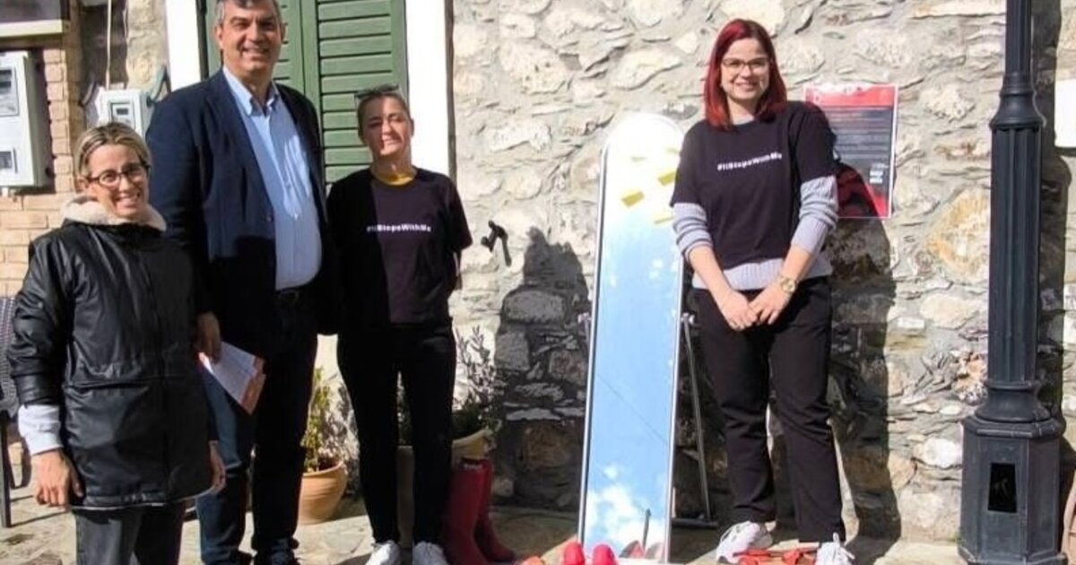 Εκεί παρουσιάστηκε μια εγκατάσταση με κόκκινα παπούτσια, τα οποία αντιπροσωπεύουν τις γυναίκες, θύματα έμφυλης και ενδοοικογενειακής βίας. Δίπλα τους, ένας καθρέπτης που αποτυπώνει τον συμβολισμό της απώλειας της ταυτότητας, της αυτοεκτίμησης και της προσωπικής ελευθερίας, που συχνά συνοδεύει τη χρόνια κακοποίηση.