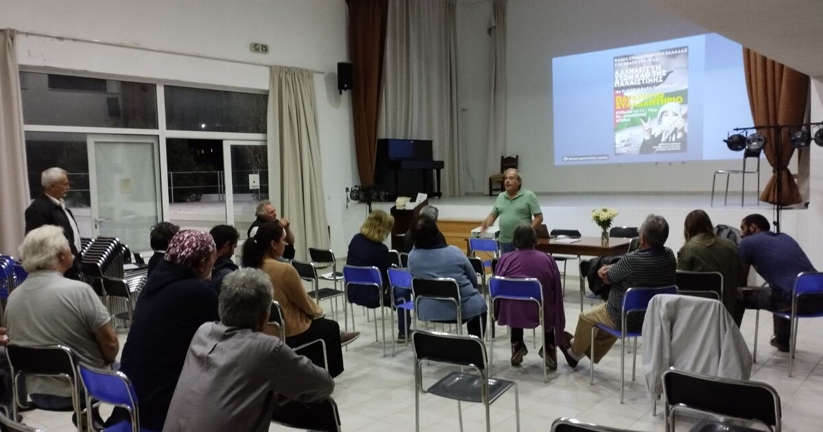 Με επιτυχία ολοκληρώθηκε την Παρασκευή 10 Νοέμβρη η εκδήλωση της Επιτροπής Ειρήνης Ηρακλείου στη Βιάννο, με θέμα: «Tι συμβαίνει στην Παλαιστίνη;» και με ομιλητή το Γιάννη Δαλέζιο, Αν. Καθηγητή της Ιατρικής Σχολής του Πανεπιστημίου Κρήτης και μέλος της Γραμματείας της Επιτροπής Ειρήνης.