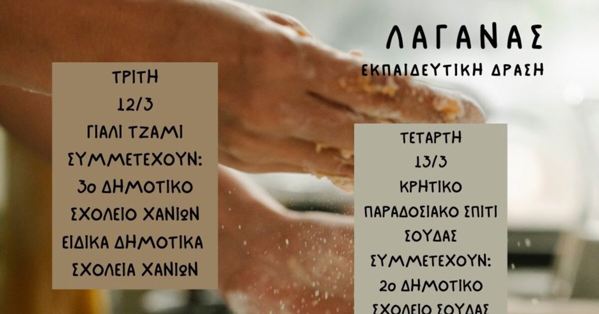Το Τμήμα Παιδείας και Δια βίου Μάθησης του Δήμου Χανίων και η Διεύθυνση Πρωτοβάθμιας Εκπαίδευσης Ν. Χανίων, σε συνεργασία με το Δημοτικό Λιμενικό Ταμείο Χανίων και τον Πολιτιστικό Σύλλογο Σούδας, διοργανώνουν εργαστήρια λαγάνας, με αφορμή την Καθαρά Δευτέρα και τη Σαρακοστή.