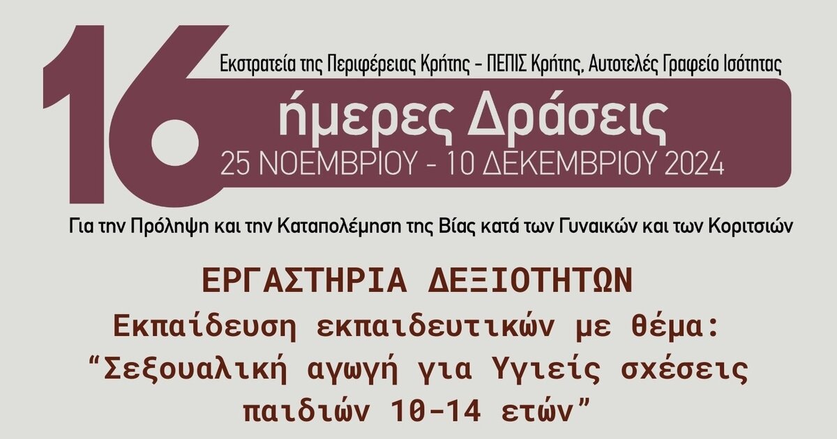 Η ομάδα Ασφαλή Ξένοιαστα Παιδιά Τώρα Α.ΞΕ.Π.Τ., μέλος του Παγκόσμιου Οργανισμού Σεξουαλικής Υγείας (WAS), διοργανώνει ένα μοναδικό διαδραστικό εργαστήριο δεξιοτήτων για εκπαιδευτικούς, στο πλαίσιο των 16 Ημερών Δράσεων της Περιφέρειας Κρήτης - Αυτοτελούς Γραφείου Ισότητας και Περιφερειακής Επιτροπής Ισότητας των Φύλων (Π.ΕΠ.ΙΣ.) για την Πρόληψη και Αντιμετώπιση της Βίας κατά των Γυναικών και των Κοριτσιών, σε συνεργασία με Διεύθυνση Δημόσιας Υγείας και Κοινωνικής Μέριμνας της Π.Ε. Ρεθύμνου, της Δημοτικής Επιτροπής Ισότητας των Φύλων (Δ.ΕΠ.ΙΣ.) Ρεθύμνου και των Διευθύνσεων Π.Ε & Δ.Ε. Ν. Ρεθύμνου.