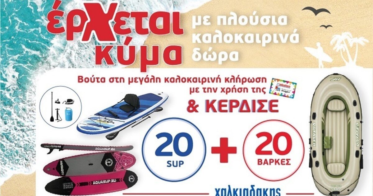 Και επειδή οι κληρώσεις και τα δώρα δεν σταματάνε ποτέ στα Super Markets Χαλκιαδάκης, έρχεται «κύμα» με τα πιο super καλοκαιρινά δώρα! 40 φουσκωτές βάρκες και SUP σας περιμένουν για το πιο διασκεδαστικό καλοκαίρι! Υποδεχόμαστε το καλοκαίρι με δώρα που θα σας κάνουν να απολαύσετε ακόμα περισσότερο τις μοναδικές παραλίες της Κρήτης μας! Η συμμετοχή και σε αυτή την κλήρωση είναι απλή, χρησιμοποιώντας την xtra card Χαλκιαδάκης σε όλες τις αγορές σας και επιλέγοντας τα αγαπημένα σας προϊόντα.