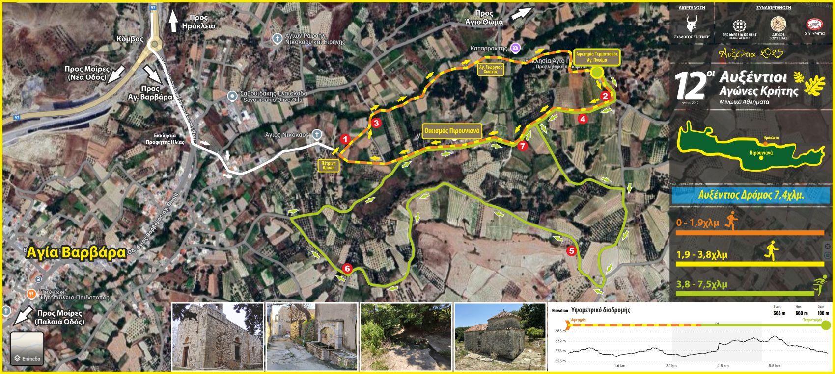 Δείτε τη διαδρομή του αγώνα δρόμου 7,4χλμ με μικρή παραλλαγή από τις προηγούμενες χρονιές καθώς η αφετηρία και ο τερματισμός θα είναι στο Άγιο Πνεύμα και όχι ο οικισμός Πιρουνιανών:
