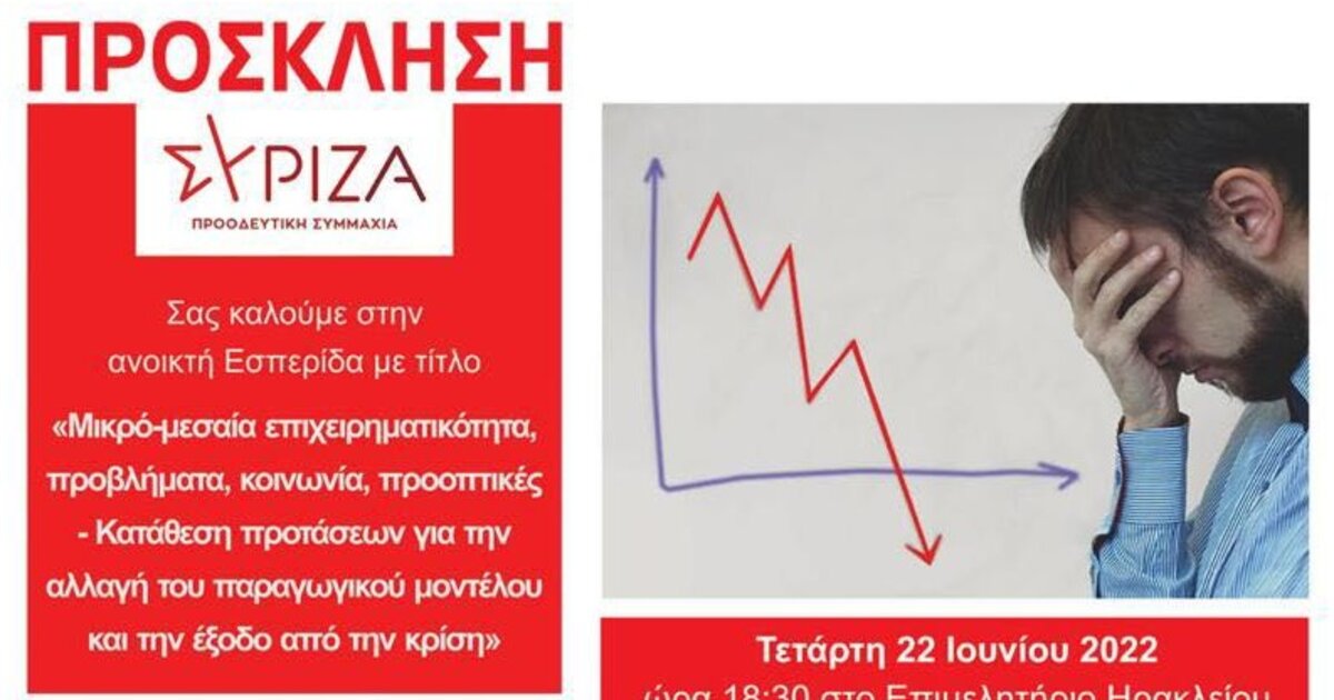 Την εσπερίδα διοργανώνει η Ομάδα Εργασίας Μικρό-Μεσαίας Επιχειρηματικότητας, Κοινωνικής και Αλληλέγγυας Οικονομίας και Εξωστρέφειας της Νομαρχιακής Επιτροπής Ηρακλείου του ΣΥΡΙΖΑ-ΠΣ.