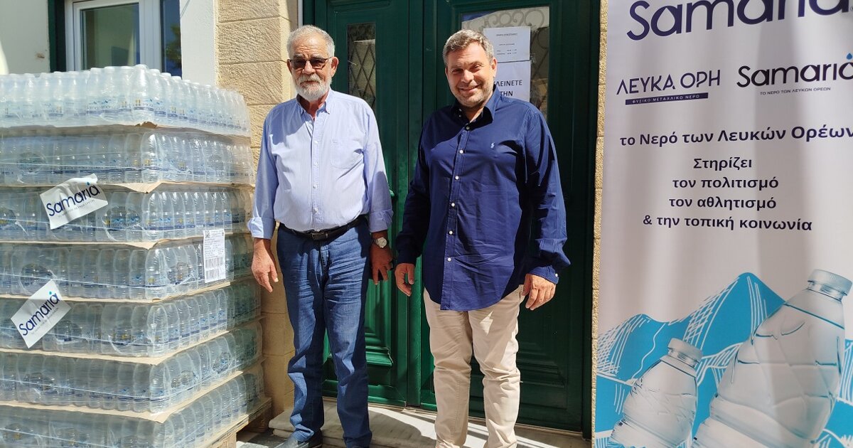 Κεντρική φωτογραφία: Ο Πρόεδρος του Γηροκομείου Χανίων κ. Στέλιος Βαλυράκης (δεξιά) λίγο πριν παραλάβει τα νερά ΣΑΜΑΡΙΑ από τον Πρόεδρο της ΕΤΑΝΑΠ κ. Μανώλη Αποστολάκη