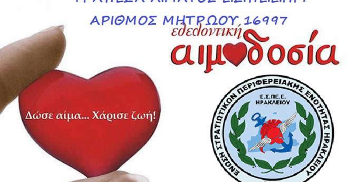 "Το Διοικητικό Συμβούλιο της Ένωσης Στρατιωτικών Περιφερειακής Ενότητας Ηρακλείου, στο πλαίσιο των αρμοδιοτήτων του να εφαρμόσει πολιτικές και να πραγματοποιεί δράσεις, οι οποίες στοχεύουν στην κοινωνική προστασία και αλληλεγγύη και στην αναβάθμιση της ποιότητας ζωής των μελών του, στην εξυπηρέτηση των αναγκών τους, αλλά και έχοντας βιώσει την ουσιαστική προσφορά προς τον άνθρωπο, της δωρεάς του αίματος, σας καλεί από 08:30 πμ έως 13:30μμ την Δευτέρα στις 10 Φεβρουαρίου, σε εθελοντική αιμοδοσία για την ενίσχυση της Τράπεζας Αίματος της Ένωσης, σε συνεργασία με το Τμήμα αιμοδοσίας του Γενικού Νοσοκομείου Ηρακλείου «ΒΕΝΙΖΕΛΕΙΟ».
