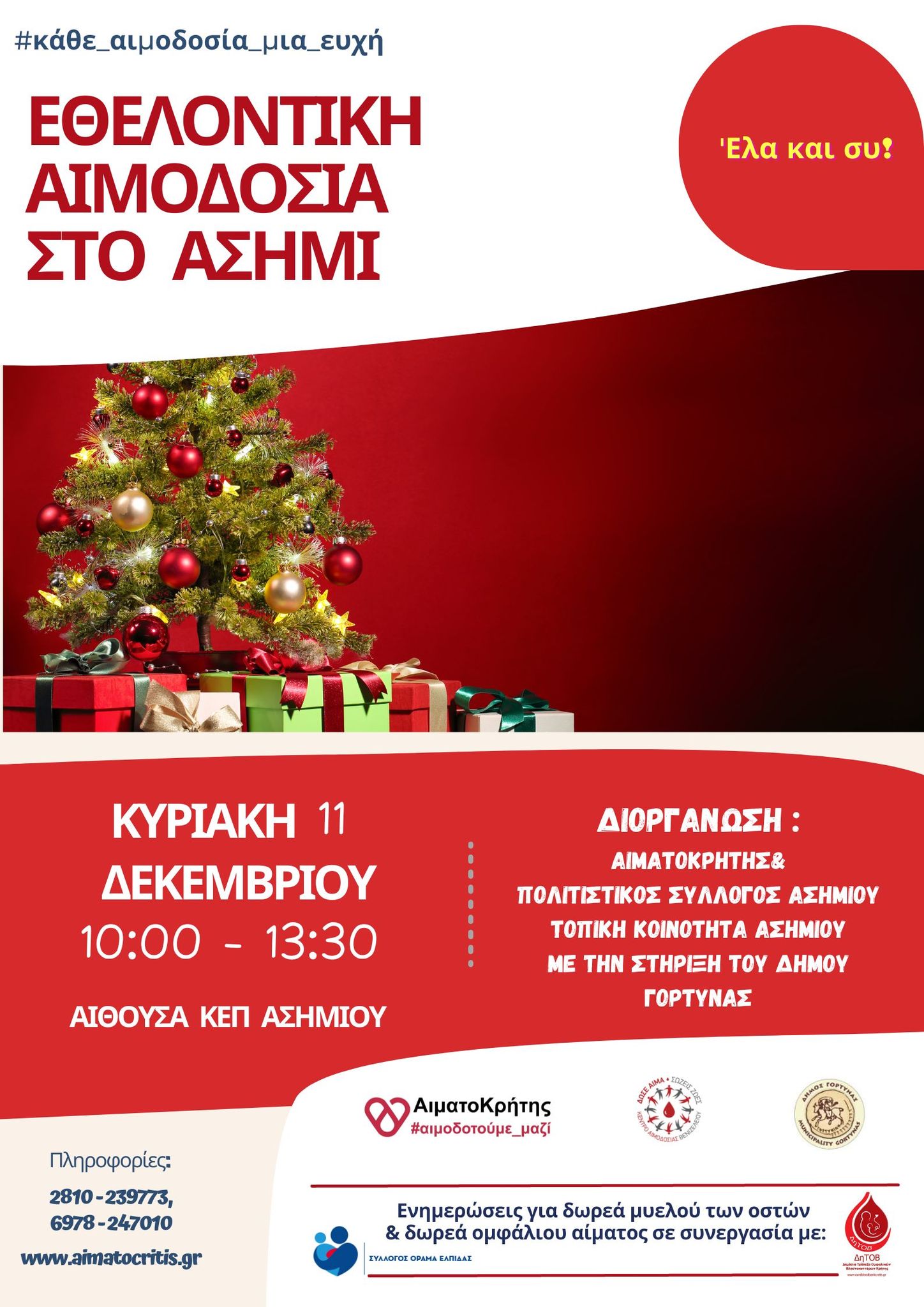 Ο Παγκρήτιος Σύνδεσμος Εθελοντών Αιμοδοτών & Δωρητών Οργάνων Σώματος «Αιματοκρήτης», ο Πολιτιστικός Σύλλογος και η Τοπική Κοινότητα Ασημίου, με την υποστήριξη του Δήμου Γόρτυνας, συνδιοργανώνουν την Κυριακή 11 Δεκεμβρίου εθελοντική αιμοδοσία στο Ασήμι.