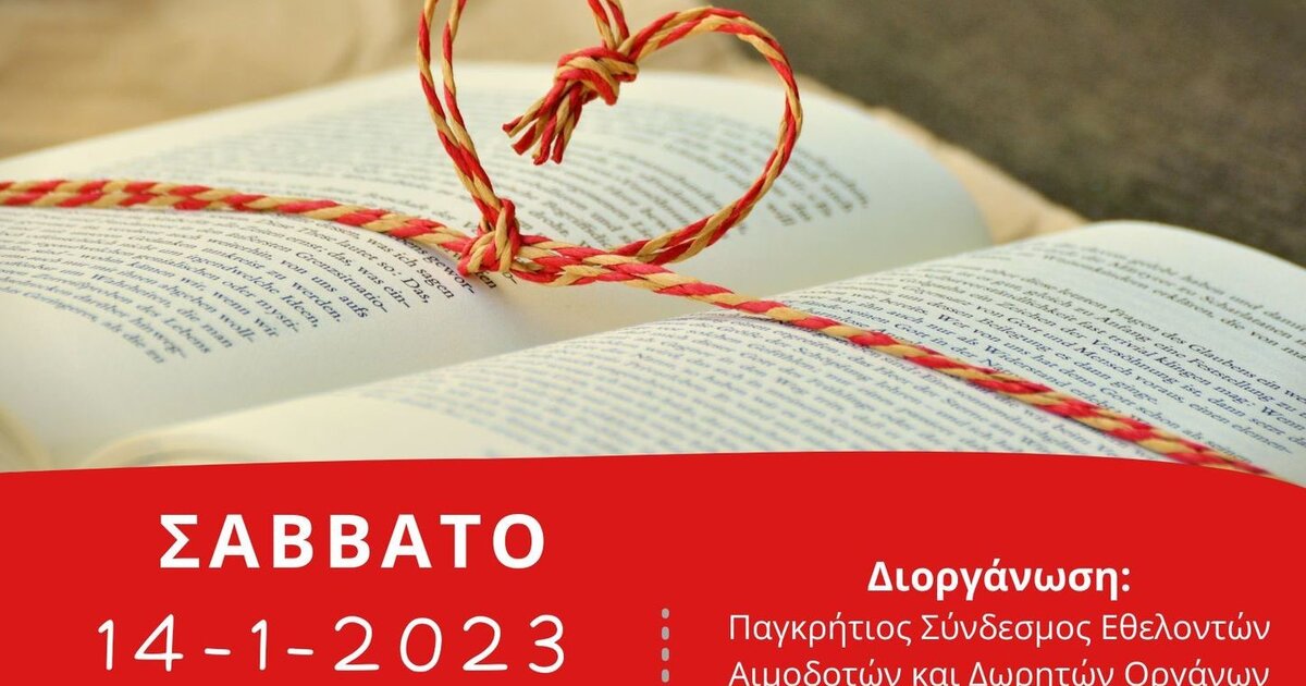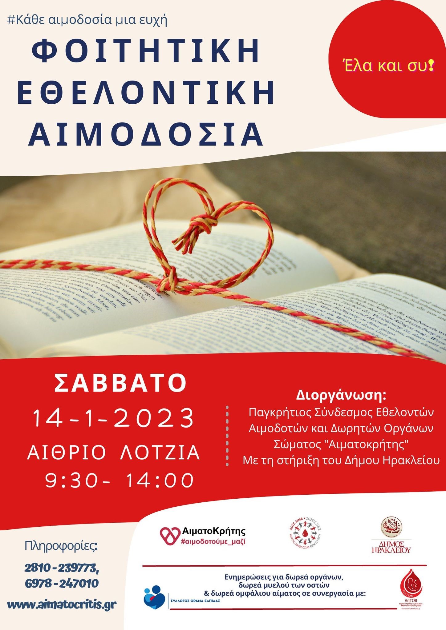 Εθελοντική αιμοδοσία θα πραγματοποιηθεί το Σάββατο 14/01/2023 στο κέντρο της πόλης του Ηρακλείου και συγκεκριμένα στο αίθριο της Λότζια από τις 9:30 έως τις 14:00 .