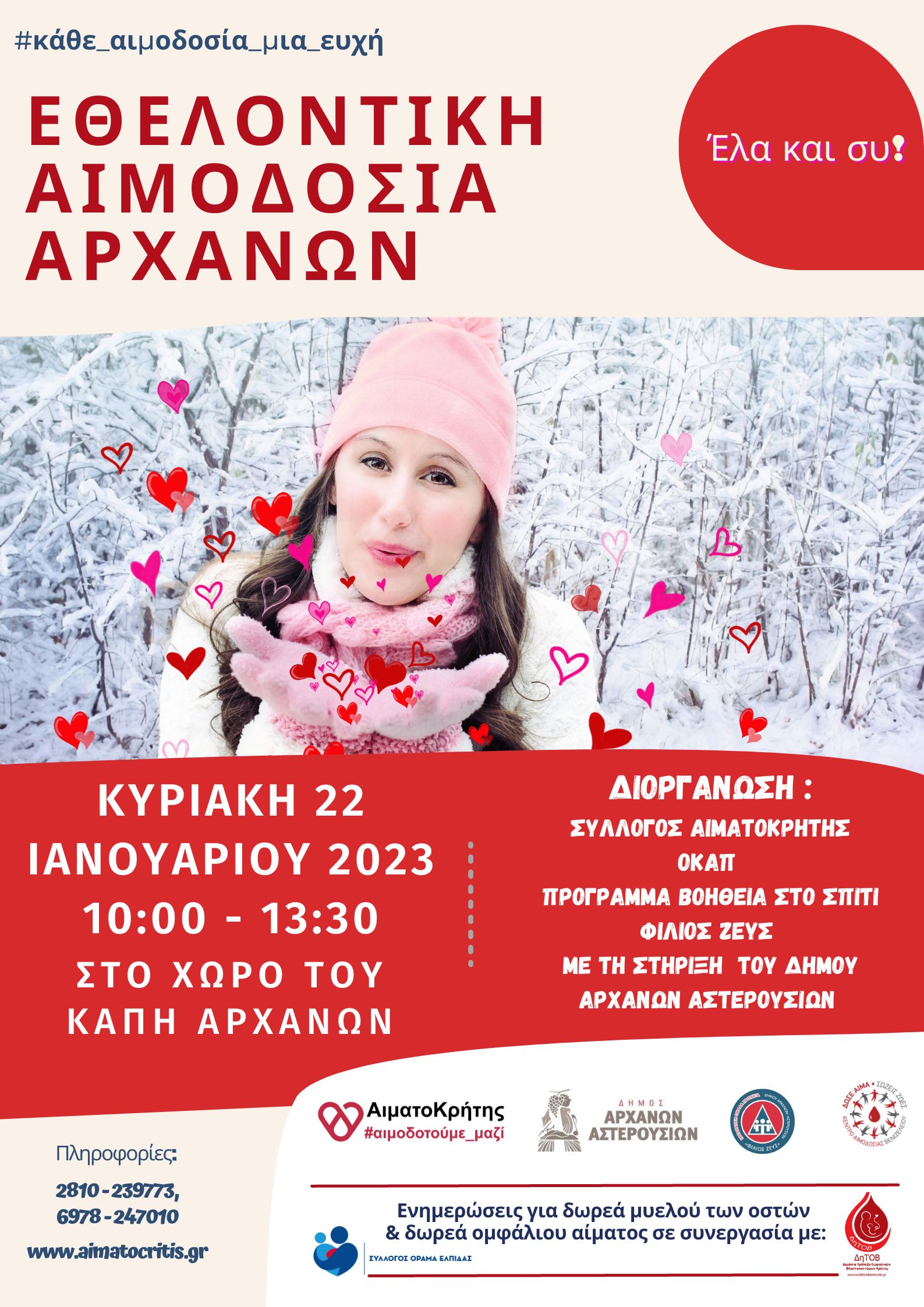 Εθελοντική Αιμοδοσία θα πραγματοποιηθεί την Κυριακή 22/1/2023 στην αίθουσα ΚΑΠΗ Αρχανών και ώρες 10:00-13:30. Την αιμοδοσία διοργανώνει ο Παγκρήτιος Σύνδεσμος Εθελοντών Αιμοδοτών και Δωρητών Οργάνων Σώματος «Αιματοκρήτης» με τη στήριξη του Δήμου Αρχανών Αστερουσίων, του ΟΚΑΠ και του προγράμματος Βοήθεια στο Σπίτι και τη συμμετοχή του Φίλιου Ζευς σε συνεργασία με την κινητή μονάδα αιμοδοσίας του Βενιζελείου Νοσοκομείου Ηρακλείου.