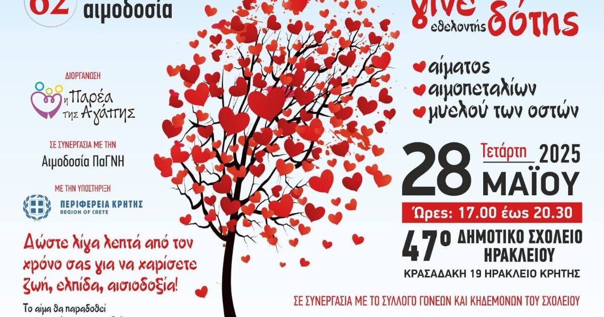 Η «Παρέα της Αγάπης», σε συνεργασία με την Αιμοδοσία του Πανεπιστημιακού Γενικού Νοσοκομείου Ηρακλείου (ΠαΓΝΗ) και με την υποστήριξη της Περιφέρειας Κρήτης, διοργανώνει την 62η εθελοντική αιμοδοσία την Τετάρτη 28 Μαΐου 2025, από τις 17:00 έως τις 20:30, στο 47ο Δημοτικό Σχολείο Ηρακλείου (οδός Κρασαδάκη 19).