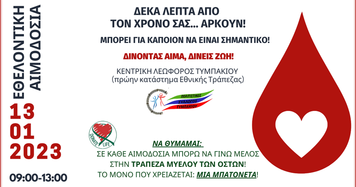 "Μετά από επαναλαμβανόμενες ανακοινώσεις από το Υπουργείου Υγείας σχετικά με την τεράστια έλλειψη αίματος που εξακολουθεί να υπάρχει στο σύστημα υγείας λόγω των πολλαπλών λοιμώξεων αλλά και λόγω του κορωνοϊού και σύμφωνα πάντα με το συντονισμένο πρόγραμμα όλων των νοσοκομείων του νησιού μας για όσο το δυνατόν συχνότερες αιμοδοσίες, ο Πολιτιστικός Σύλλογος Τυμπακίου, συμμετέχοντας σε μία κοινή πορεία δράσεων με το Περιφερειακά Νοσοκομεία του Νομού Ηρακλείου και όλων των αρμόδιων φορέων, προσκαλεί τους εθελοντές αιμοδότες σε μία ακόμα αιμοδοσία την Παρασκευή 13 Ιανουαρίου 2023 στο Τυμπάκι, στην Κεντρική Λεωφόρο Τυμπακίου, στο πρώην κατάστημα της Εθνικής Τράπεζας!