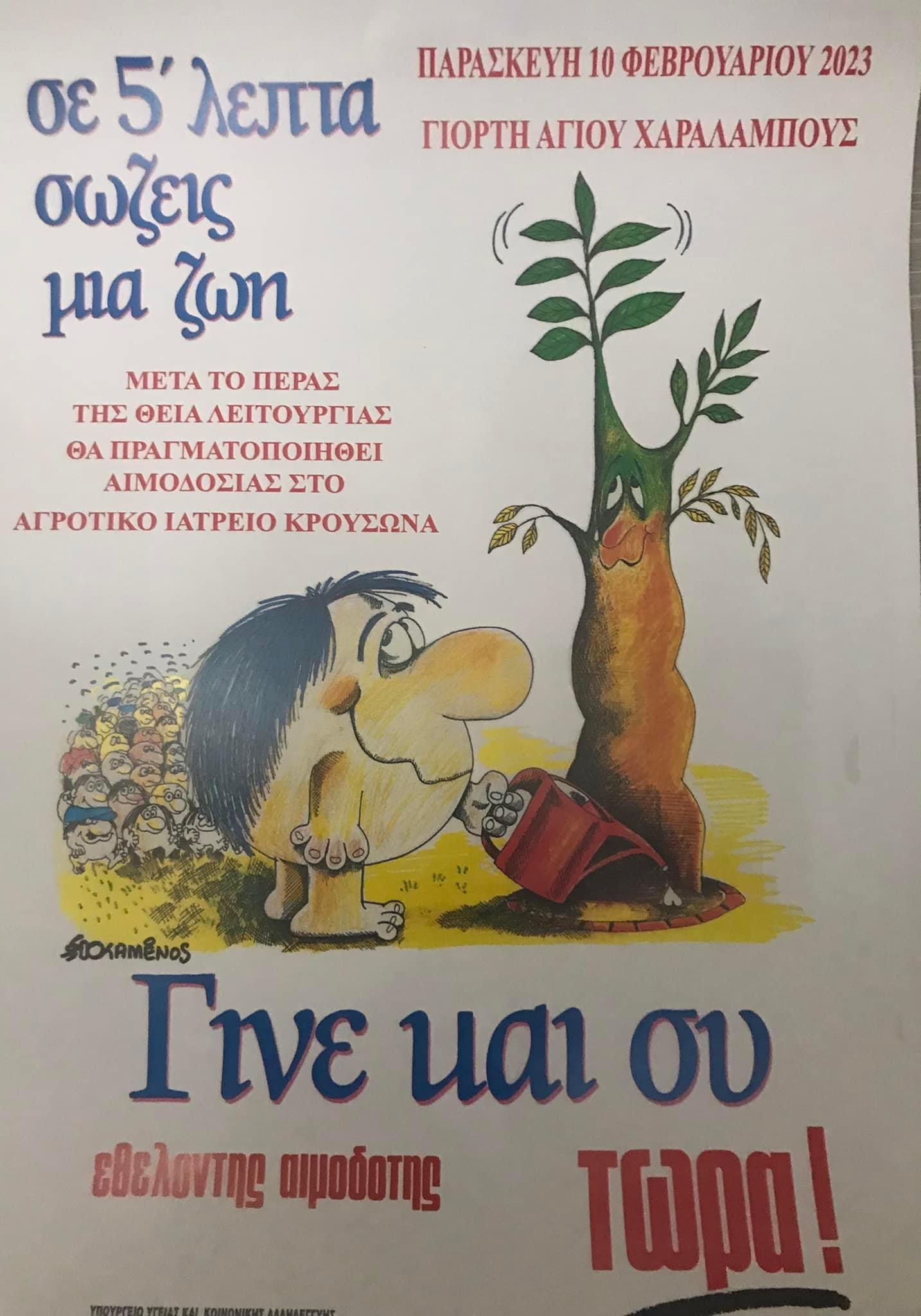 Η Ενορία Κρουσώνα , το περιφερειακό ιατρείο Κρουσώνα , ο ΠΑΟΚρουσώνα, ο Πολιτιστικος σύλλογος , ο σύλλογος εμπόρων , οι σύλλογοι γονέων και κηδεμόνων των σχολείων διοργανώνουν την Παρασκευή 10 Φεβρουαρίου μετά το πέρας της θείας λειτουργίας εθελοντική αιμοδοσία.