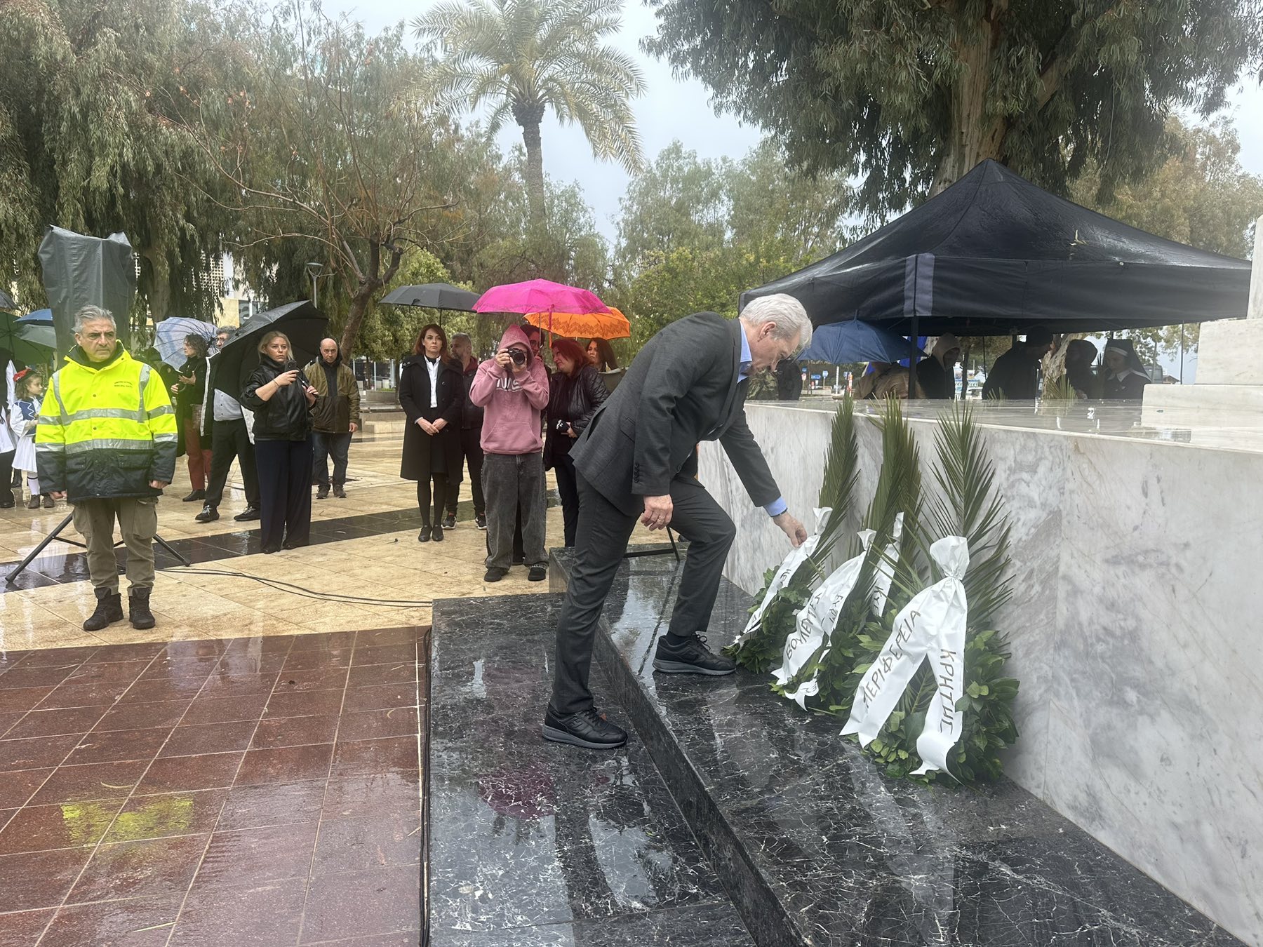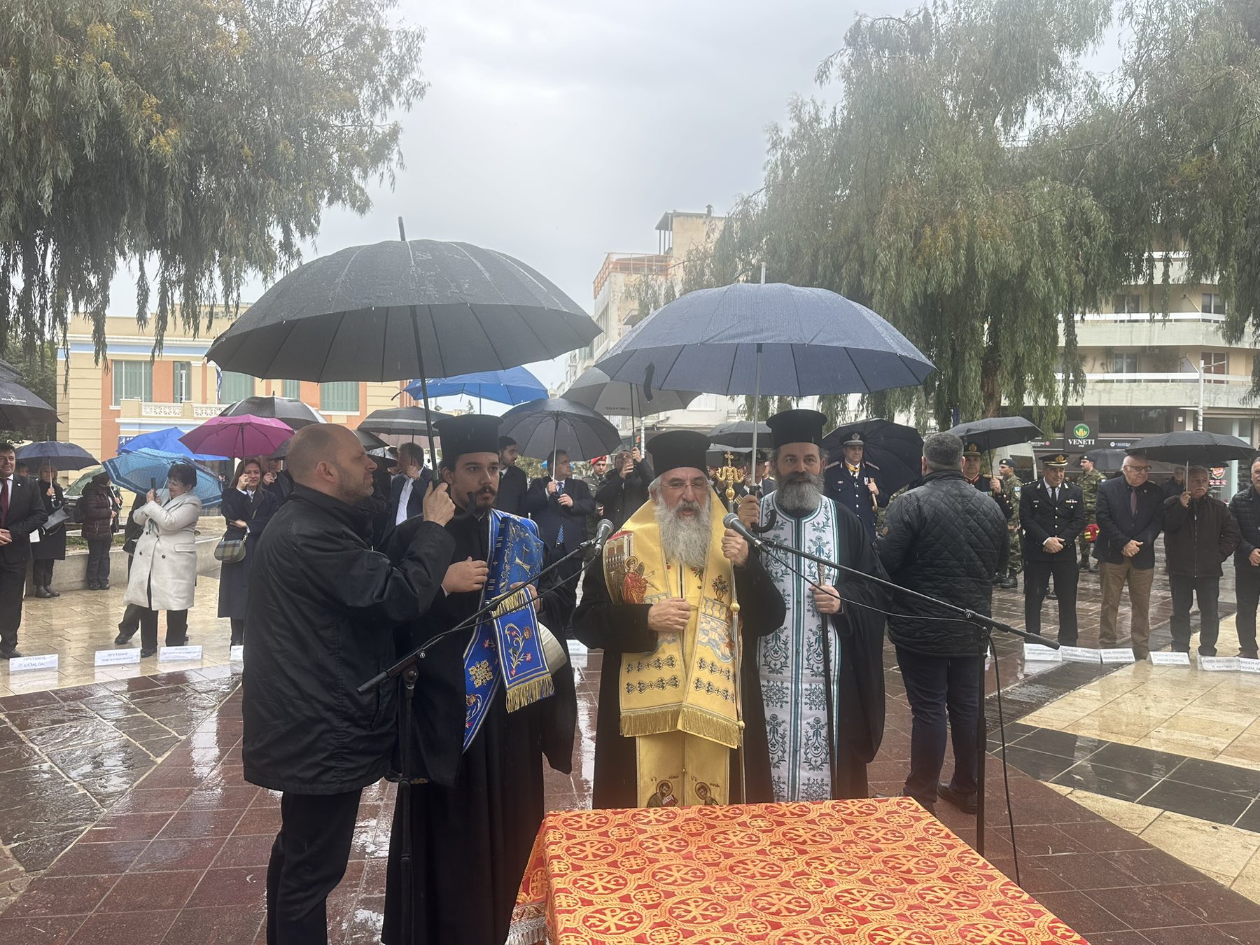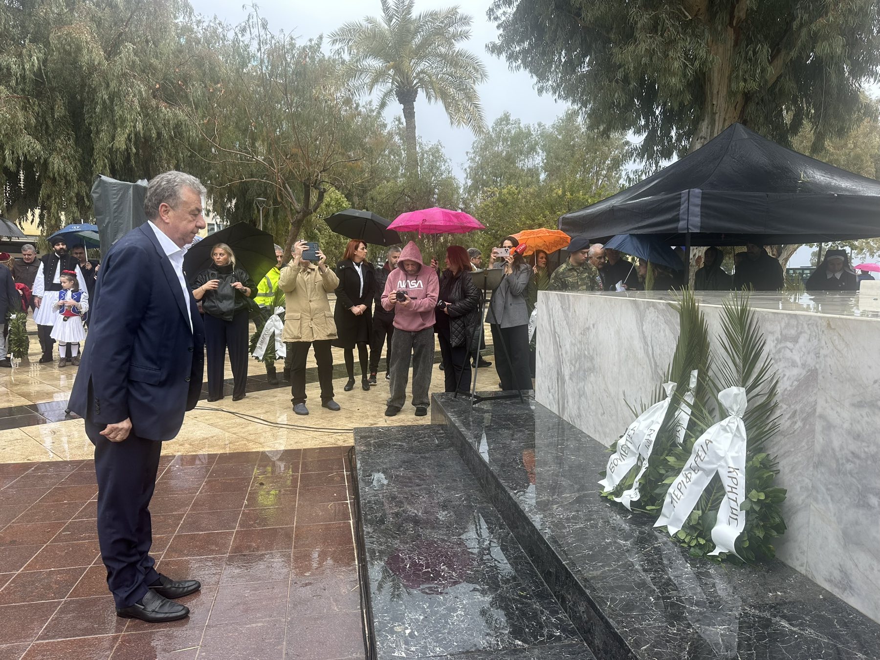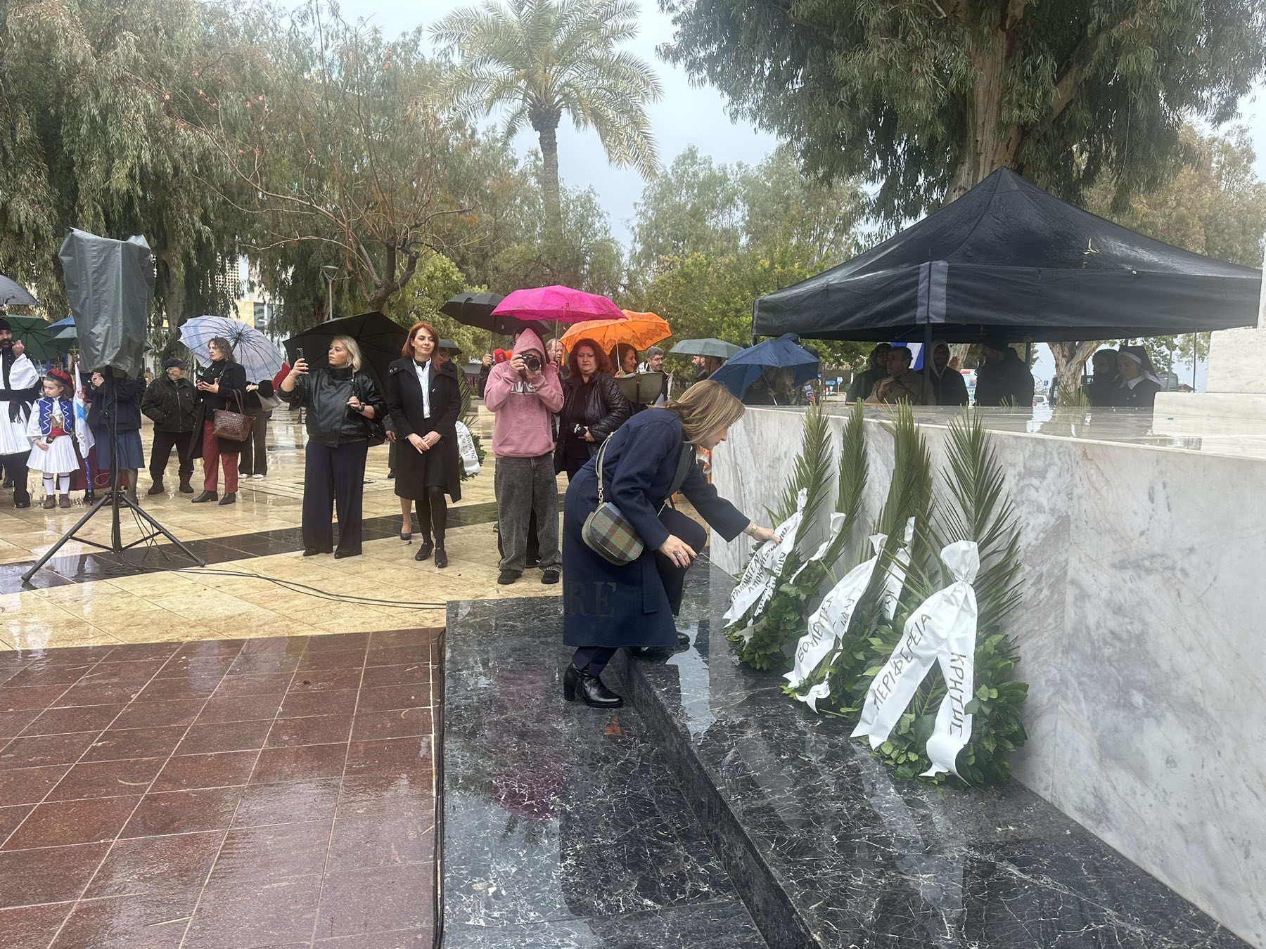 Η Δοξολογία στον Ιερό Ναό του Αγίου Τίτου πραγματοποιήθηκε κανονικά, όπως και η κατάθεση στεφάνων από τις αρχές του τόπου στο Μνημείο του Αγνώστου Στρατιώτη, που ακολούθησε – υπό καταρρακτώδη βροχή μάλιστα-, στην πλατεία Ελευθερίας.