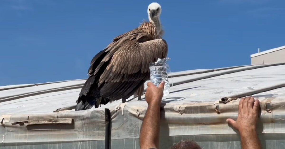 Όλοι μαζί, κατάφεραν να κατεβάσουν το αδύναμο όρνιο από το θερμοκήπιο, το μετέφεραν στη σκιά όπου το έπλυναν και το δρόσισαν ενώ του έδωσαν να πιει και νερό.