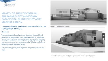 Σβαρτς και Πωλογιώργη, την ανάπλαση του Ανατολικού Αναχώματος, την προστασία και αποκατάσταση του Επιπρομαχώνα του Αγίου Δημητρίου, την αποκατάσταση και προστασία του Προμαχώνα ΜOCENIGO, την ενεργειακή αναβάθμιση του 9ου Δημοτικού Σχολείου Χανίων, την ανάπλαση του κάτω Κουμ Καπί, τη διαμόρφωση της οδού Τζανακάκη σε δρόμο ήπιας κυκλοφορίας με ποδηλατόδρομο, καθώς και την κατασκευή του πολυδύναμου δημοτικού κέντρου κοινωνικών δομών και υπηρεσιών Ρεγγίνα.