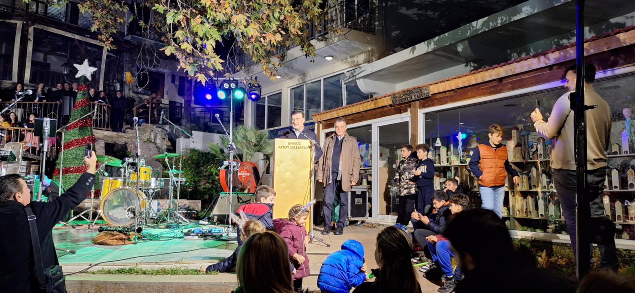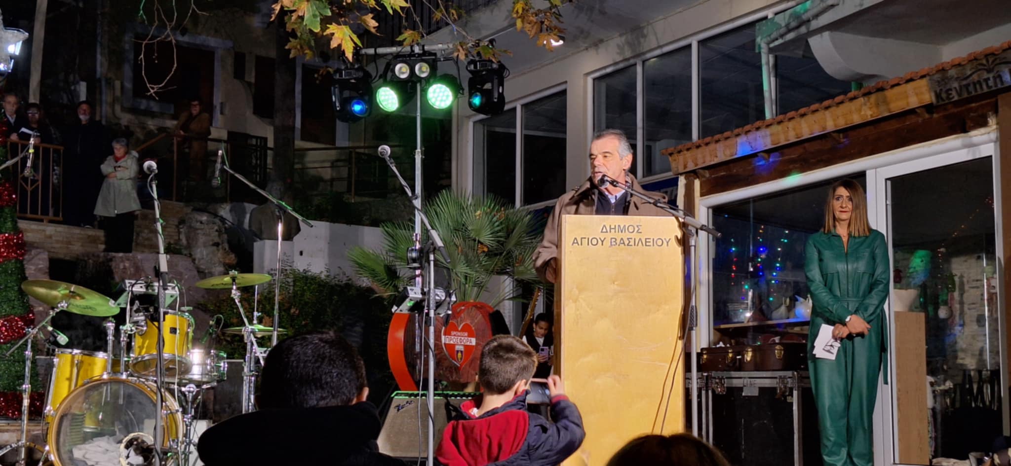 Πριν τη φωταγώγηση του δέντρου, ο Δήμαρχος Αγίου Βασιλείου, Γιάννης Ταταράκης, απηύθυνε θερμό χαιρετισμό, ευχόμενος υγεία, ευτυχία και δημιουργικότητα. Ο Δήμαρχος τόνισε ότι στόχος του Δήμου είναι να προσδώσει σε αυτή την περίοδο έναν ιδιαίτερα εορταστικό χαρακτήρα με αυτή την όμορφη εκδήλωση που στο επίκεντρό της έχει τα παιδιά, στα οποία οφείλουμε να προσφέρουμε ό,τι περισσότερο μπορούμε για να απολαύσουν ξέγνοιαστες και όμορφες γιορτές. Επίσης υπογράμμισε το νόημα το εορτών, κι αυτό δεν είναι άλλο από αγάπη, ανθρωπιά και αλληλεγγύη για την οικογένεια μας, για τους φίλους μας, τον γείτονα μας, τον συγχωριανό μας και γενικά για τον συνάνθρωπο μας και επισήμανε ότι δεν πρέπει με ξεχνάμε αυτές τις μέρες τους λαούς που δοκιμάζονται και τα παιδιά που ζουν την φρίκη των πολέμων ενώ δεν παρέλειψε να ευχαριστήσει όσους συνέβαλαν στην όμορφη γιορτή.