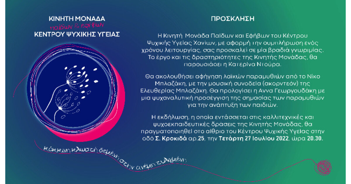Η Κινητή Μονάδα Παιδιών και Εφήβων του Κέντρου Ψυχικής Υγείας Χανίων, με αφορμή την συμπλήρωση ενός χρόνου λειτουργίας, σας προσκαλεί σε μία βραδιά γνωριμίας. Το έργο και τις δραστηριότητες της Κινητής Μονάδας, θα παρουσιάσει η Κατερίνα Ντούρα.