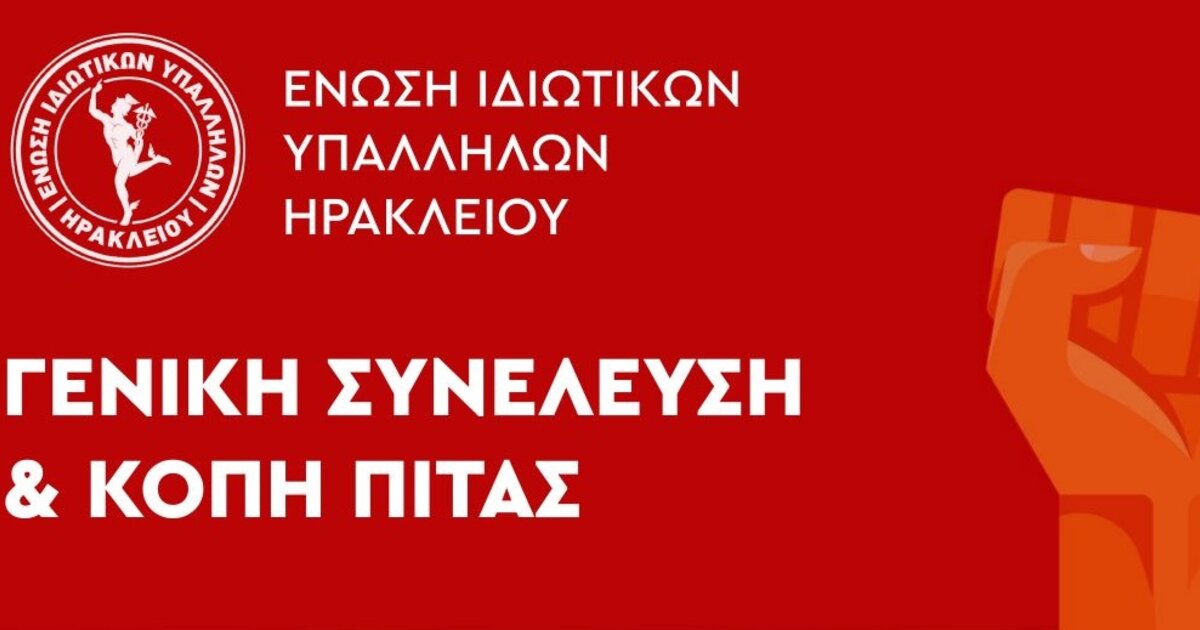 Γενική συνέλευση και κοπή πίτας πραγματοποιεί, την Κυριακή 4 Φεβρουαρίου η Ένωση Ιδιωτικών Υπαλλήλων Ηρακλείου, στις 18.00 το απόγευμα στο Εργατικό Κέντρο Ηρακλείου.