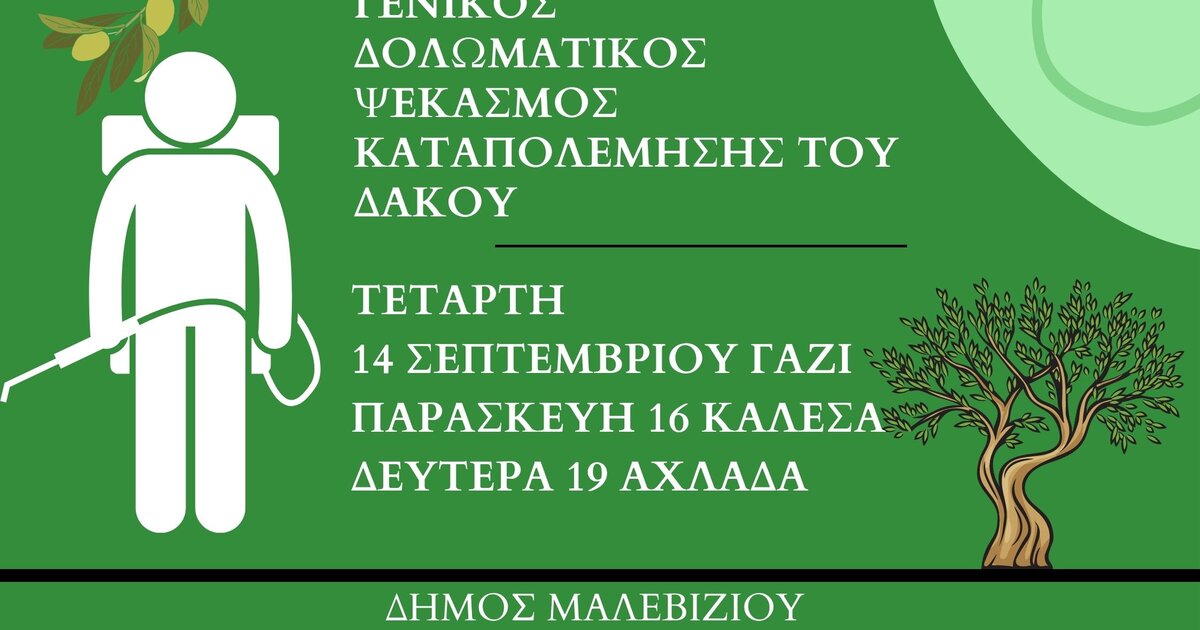 Παρακαλούνται όσοι ελαιοπαραγωγοί έχουν περιφραγμένα ελαιόφυτα να μεριμνήσουν ώστε ο εργολάβος ψεκασμού να έχει πρόσβαση στα δένδρα τους για να μπορεί να τα ψεκάσει και οι βιοκαλλιεργητές να σημαδέψουν τα ελαιόφυτά τους για να αποφευχθεί ανεπιθύμητος ψεκασμός.