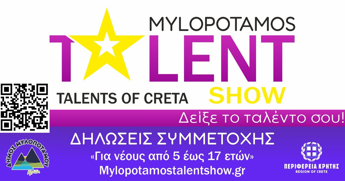 Το "Mylopotamos Talents of Creta 2025", που διοργανώνεται από τον Πολιτιστικό Σύλλογο Καλυβού Μυλοποτάμου, με τη συνδιοργάνωση της Περιφέρειας Κρήτης και του Δήμου Μυλοποτάμου, καλεί όλα τα παιδιά της Κρήτης να δείξουν το ταλέντο τους