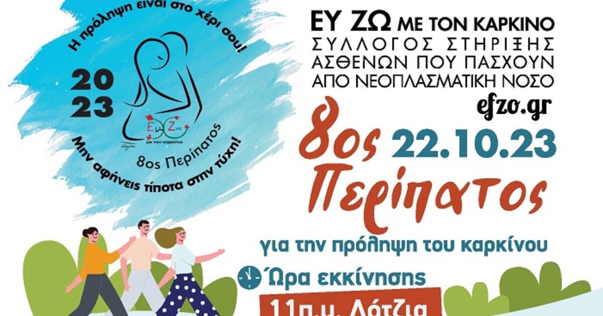 Ο Σύλλογος στήριξης ασθενών με νεοπλασματική νόσο «Ευ Ζω με τον Καρκίνο» θα πραγματοποιήσει και φέτος για 8η χρονιά, στις 22 Οκτωβρίου, ημέρα Κυριακή και ώρα 11 π.μ, Περίπατο για την πρόληψη του Καρκίνου.