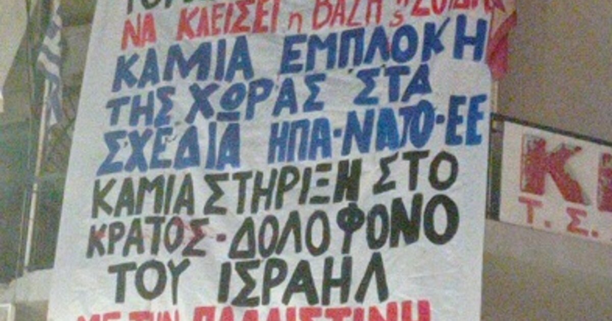 "Παράλληλα καταδίκασαν τη στήριξη του κράτους - δολοφόνου του Ισραήλ, που έχει εκφραστεί τόσο από την κυβέρνηση της ΝΔ όσο και από τα υπόλοιπα αστικά κόμματα, ΣΥΡΙΖΑ-ΠΑΣΟΚ, καλώντας τον λαό να δυναμώσει το πλατύ κύμα αλληλεγγύης στον παλαιστινιακό λαό με το σύνθημα: «Με την Παλαιστίνη ως τη λευτεριά!».