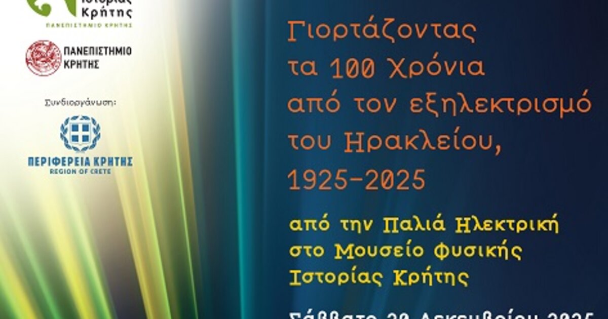 Η Περιφέρεια Κρήτης και ο Σύλλογος Φίλοι του Μουσείου Φυσικής Ιστορίας γιορτάζουν την επέτειο των 100 χρόνων από τον εξηλεκτρισμό της πόλης του Ηρακλείου στο Μουσείο Φυσικής Ιστορίας Κρήτης, το Σάββατο 20 Δεκεμβρίου 2025, από τις 11:00π.μ το πρωί μέχρι τις 9:00μ.μ το βράδυ, με ελεύθερη είσοδο.