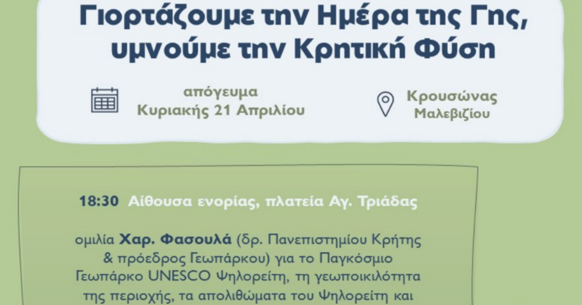 "Γιορτάζουμε την ημέρα τη ΓΗΣ, υμνούμε την Κρητική Φύση και σας προσκαλούμε στο Κρουσώνα την Κυριακή 21 Απριλίου 2024 και ώρα 6,30 μ.μ στην αίθουσα της ενορίας, πλατεία Αγ. Τριάδας.