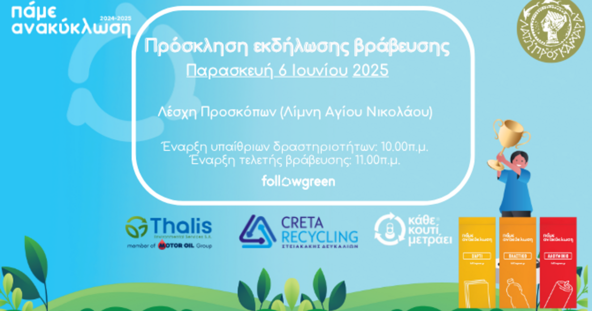 Εκδήλωση για την βράβευση των μαθητριών και των μαθητών που συμμετείχαν στον Σχολικό Μαραθώνιο «Πάμε Ανακύκλωση» στο πλαίσιο της πρωτοβουλίας Followgreen - Green schools, διοργανώνει ο Δήμος Αγίου Νικολάου την Παρασκευή 6/6/2025 στις 10.00 π.μ. στο χώρο της Λέσχης Προσκόπων στη Λίμνη του Αγίου Νικολάου.