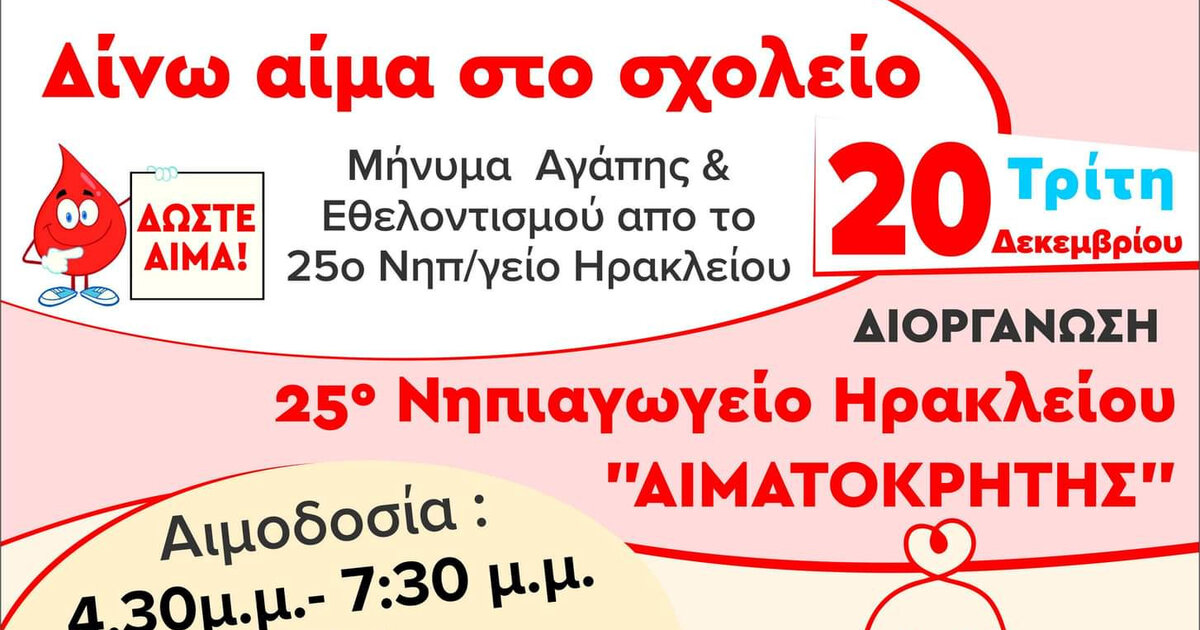 Μαθητές, γονείς και εκπαιδευτικοί του 25ου Νηπιαγωγείου Ηρακλείου, ανοίγουν τις πόρτες του σχολείου την Τρίτη 20 Δεκεμβρίου 2022 από τις 4μμ και υποδέχονται όποιον πολίτη του Ηρακλείου θέλει να δώσει αίμα ή να στηρίξει τη δράση αυτή με την παρουσία του!