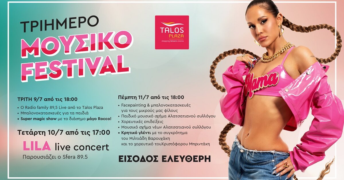 Θέλοντας να ευχαριστήσουμε όλους τους επισκέπτες μας για την προτίμησή τους στο Τalos Plaza, το μόνο εμπορικό κέντρο - στολίδι της Κρήτης, γιορτάζουμε και σας προσκαλούμε σε ένα τριήμερο μουσικό φεστιβάλ για μικρούς και μεγάλους!