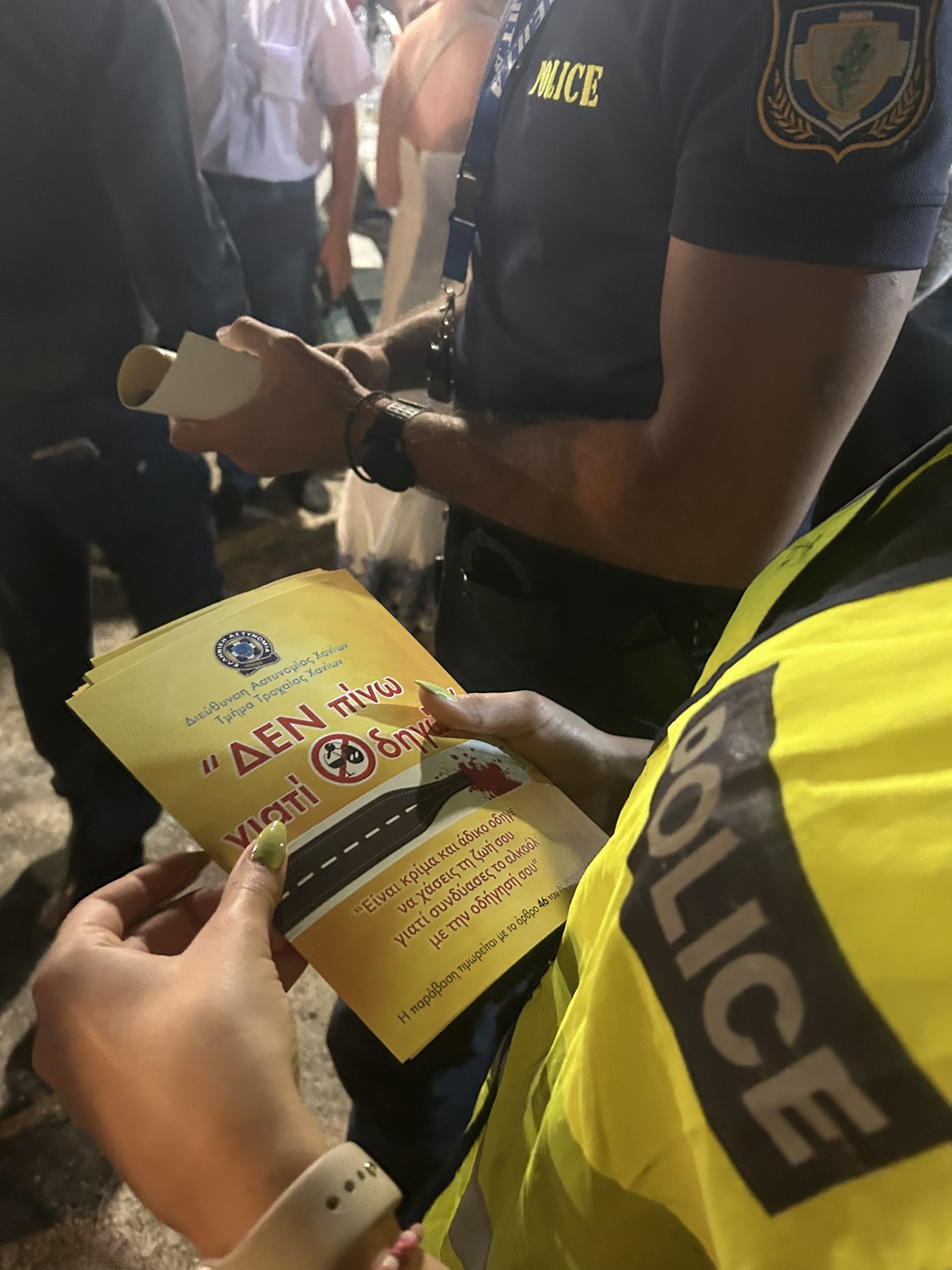 Σε παραδοσιακή πολιτιστική εκδήλωση σε περιοχή των Χανίων βρέθηκαν χθες βράδυ στελέχη της Τροχαίας, μοιράζοντας ενημερωτικά έντυπα σε παρευρισκόμενους, με σκοπό να τους υπενθυμίσουν ότι το αλκοόλ και η οδήγηση δεν πάνε μαζί!