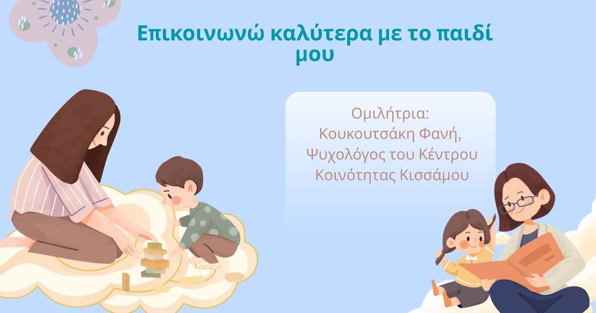 Το Κέντρο Κοινότητας Δήμου Κισσάμου σε συνεργασία με τους Δημοτικούς Παιδικούς Σταθμούς Κισσάμου, Γραμβούσας και Πλατάνου, διοργανώνει ομιλία με θέμα: