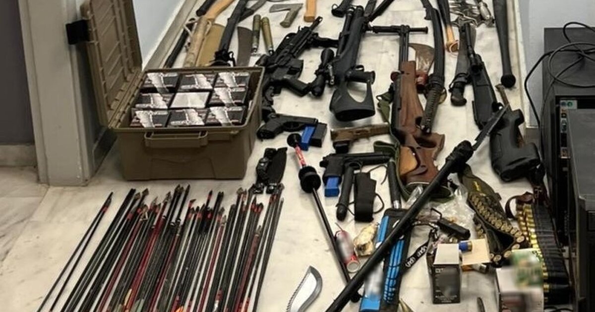Στην ανακοίνωση που εξέδωσε η Ελληνική Αστυνομία, γνωστοποιήθηκε ότι κατασχεθήκαν μεταξύ άλλων 2 δυναμίτες, 7 αεροβόλα όπλα, 5 σπαθιά, 107 τσεκούρια, 117 μαχαίρια, 3 τόξα, 3 βαλλίστρες, 741 φυσίγγια και πλήθος άλλων ειδών οπλισμού!
